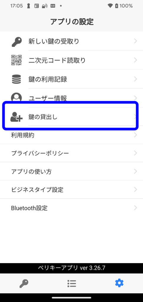 アプリベリキーの設定>鍵の貸出しボタンでWEB管理画面を表示できます。