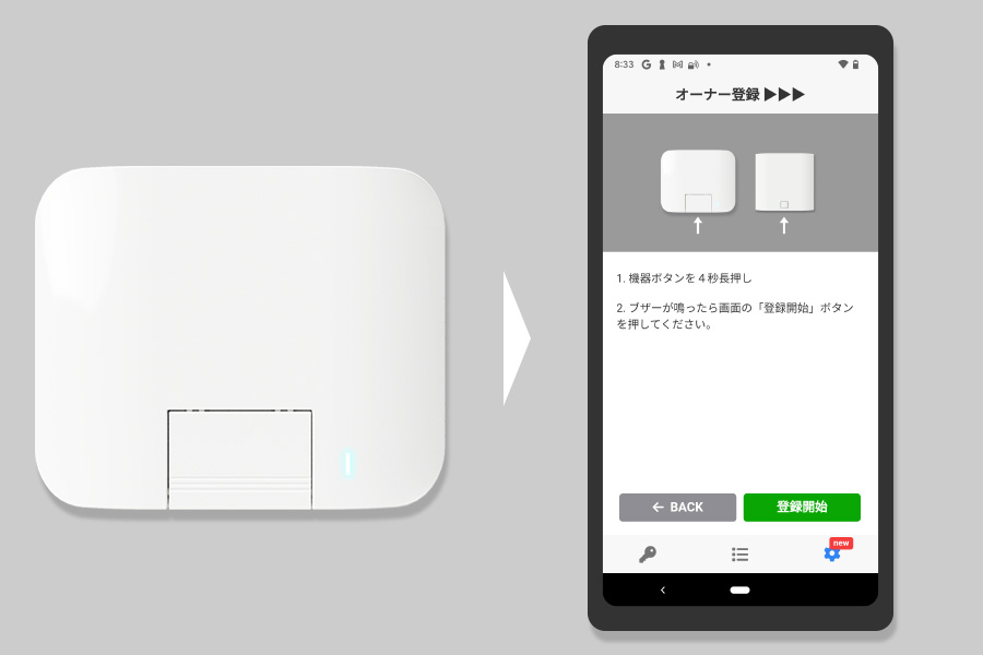 2. ブザーが鳴ったらボタンをはなし、アプリの「登録開始」ボタンをタップ。